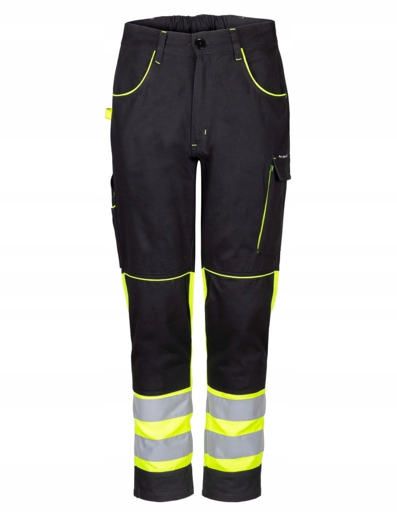 Spodnie robocze-ochronne w kolorze czarnym niebrudzącym wraz z estetycznymi żółtymi-seledynowymi wstawkami w kieszeniach przestrzennych. Rozporek na zamek błyskawiczny. Na kolanach dodatkowe wzmocnienie i kieszeń na nakolanniki. Podwójne pasy odblaskowe na nogawkach.